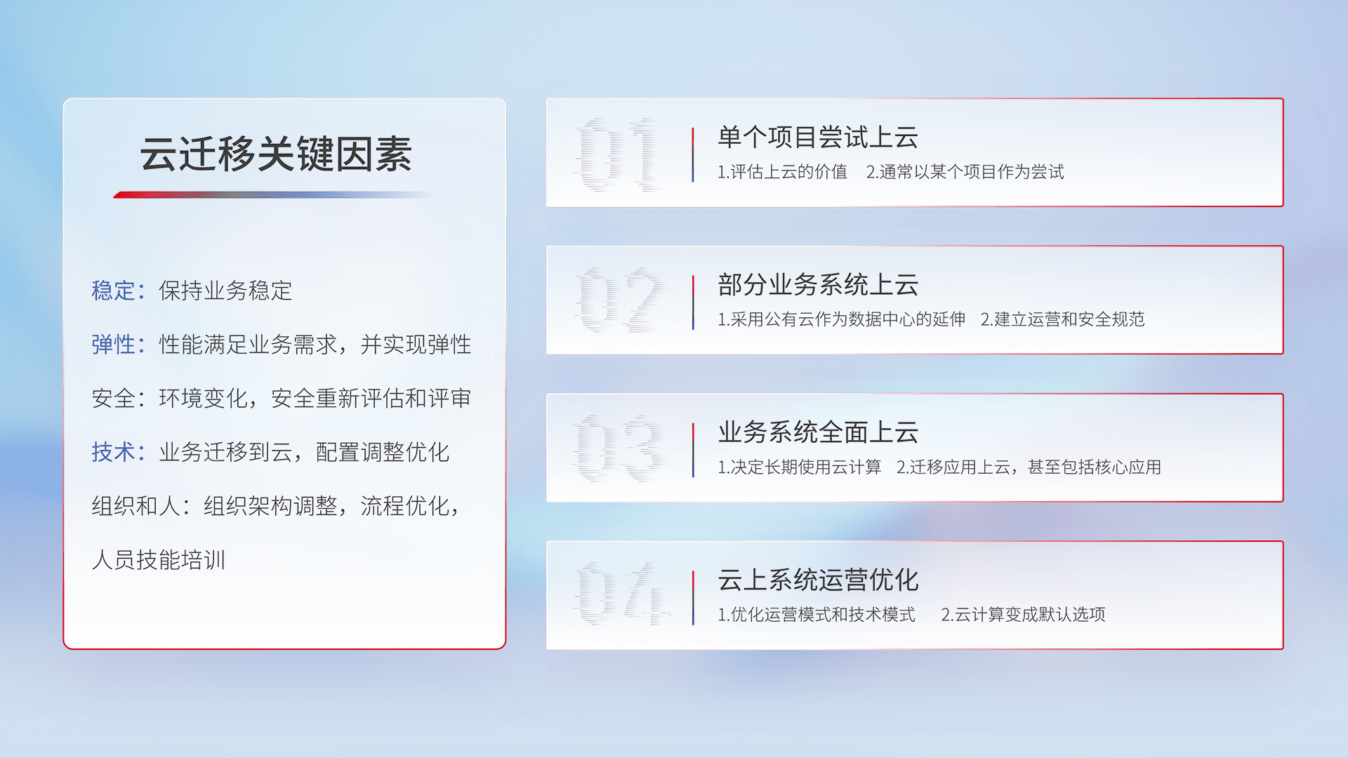 结合实际业务,,,从规划设计、、、云平台选型、、、云原生改造、、、数据迁移、、、、集成交付,,迁移全过程为客户识别最佳上云路径,,,做好风险识别管理,,,设计网络架构、、、身份权限、、、、安全审计合规、、、操作审计、、日志审计、、、、监控告警策略、、、多站点容灾设计等,,对云上基础设施进行整体规划,,,提升IT治理水平,,,以满足弹性、、、、高可用、、、、高性能的需求。。。。